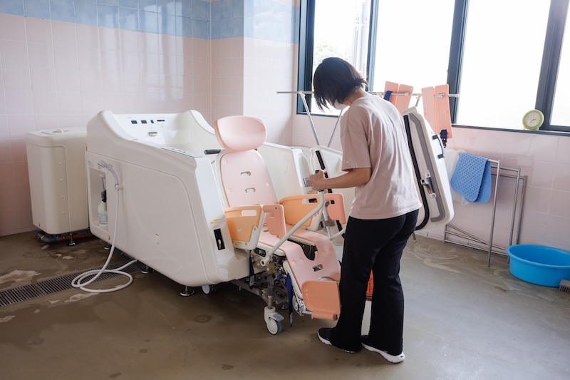 「壁を背にしてシャワーチェアを誘導するので、最初のうちは不安に感じる人もいました。ただ、壁側を向いたまま入っていく旧式の場合、お客様の様子を見るには奥にまわらねばならなかった。ルーミィの場合、背面から浴槽に入るのでお客様のお顔を見ながらになるので、微妙な表情の変化から適温かどうかを読み取ることができます」