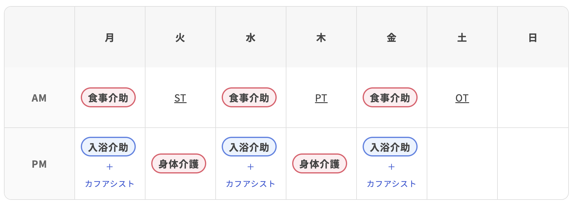 訪問介護/月水金の朝=食事介助、火・木の昼=身体介護